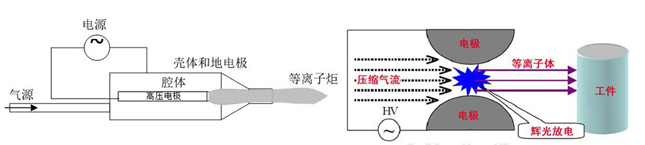 聚合物大气等离子处理机:压缩气体通入等离子喷枪内部气流通道,在电极两端施加交流高频高压,使两电极间的压缩气体电离产生气体弧光放电而形成等离子区。等离子在气流的吹动下到达被处理物体的表面而实现对3D表面进行改性的目的。(PG-1000设备)